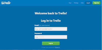 - Langkah pertama yang harus kita lakukan adalah buka web trello yaituhttps://trello.com jika sudah membuka web tersebut anda dapat log in menggunakan email yang sudah terdaftar pada trello atau menggunakan Goggle Account anda, gambarnya akan seperti berikut :